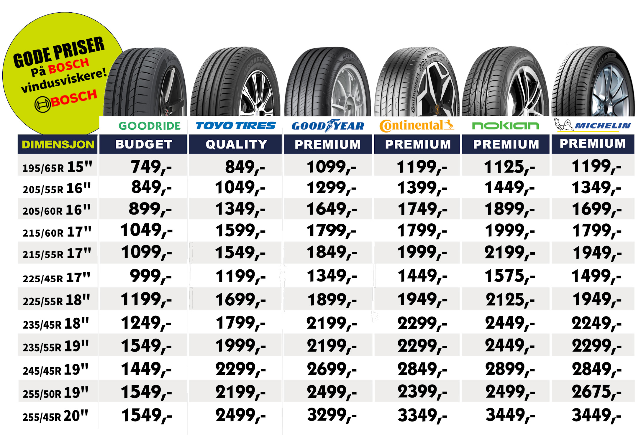 Kampanjeprisene varer t.o.m 6. April 2026. Alle oppgitte priser er inklusive merverdiavgift og gjelder ett stk sommerdekk. Miljøavgift, montering og eventuelt TPMS-ventiler tilkommer. Vi tar forbehold om feil i annonserte priser og utsolgt-situasjoner.